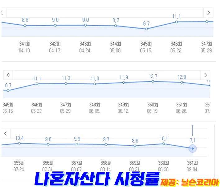 359회, 360회, 361회 시청률을 살펴보면, 8.8%, 10.1%, 7.1%였습니다. 359