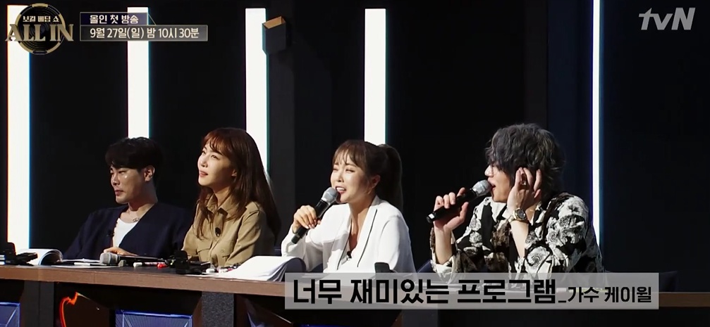 '올인' 평가위원으로는 방금 소개한 김이나, 홍진영, 뮤지, 케이윌 출연하며, 보컬리스트를