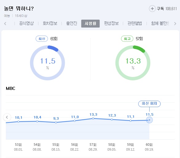 57회 이후는 13%대에서 조금 떨어진 12%, 11% 대이지만, '싹쓰리'때 보다는