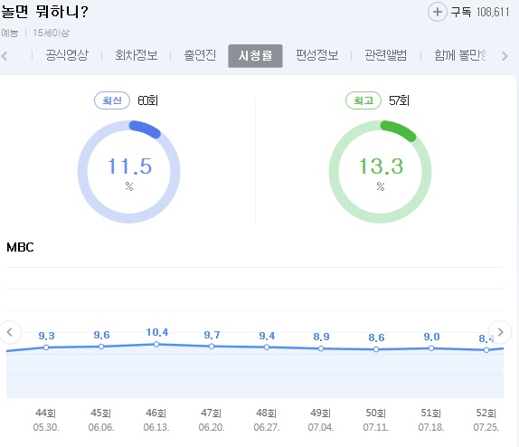 오르락 내리락 했었네요.'싹쓰리'가 출연하기 전에도 대략 7~8% 시청률을