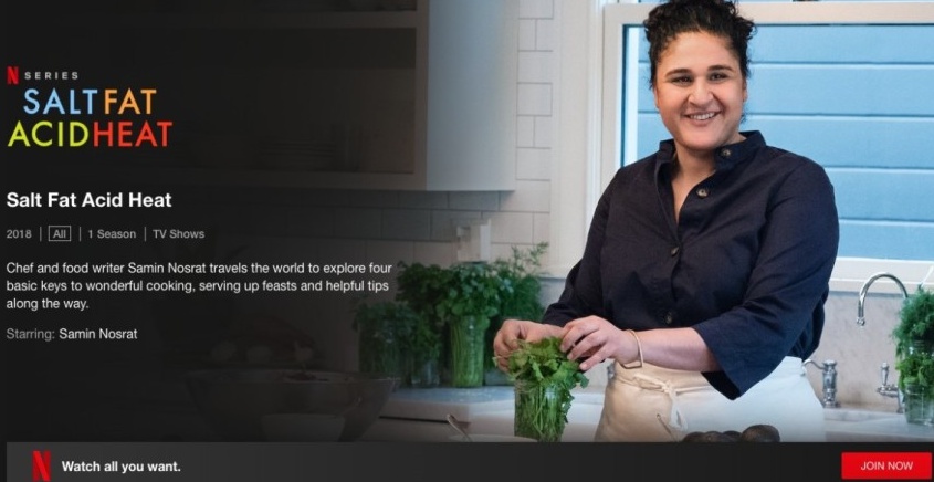 <소금,산,지방, 불> 음식 다큐멘터리에서는 요리사이자 작가인 사민 노스랏이