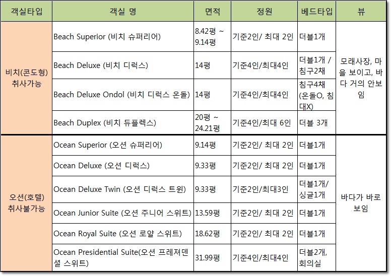 표에서 보시다시피, 객실명 앞에 비치가 들어가면 콘도형이어서 취사가 가능하며,