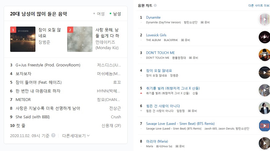 네이버에서 '음원차트순위'를 검색해 보면 '잠이 오질 않네요' 노래가 상위권에 있는것을