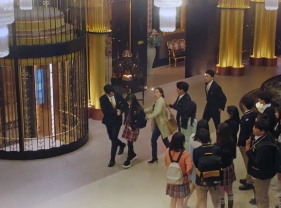천서진[김소연]이 학교에서 주단태 [엄기준]의 아들 딸인 주석훈과 주석경이