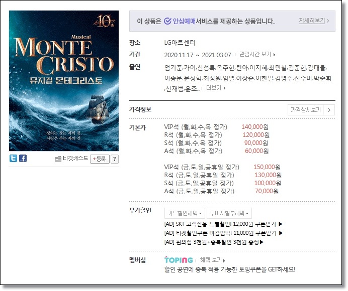 그리고 뮤지컬 몬테크리스토 A석은 50%나 할인해주니 저렴한 가격에 멋진