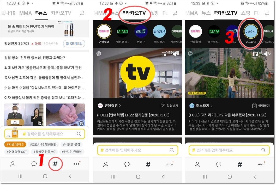 #카카오TV를 터치하면 다양한 드라마 및 프로그램이 보여요. 그중에 '며느라기'를 터치하시면