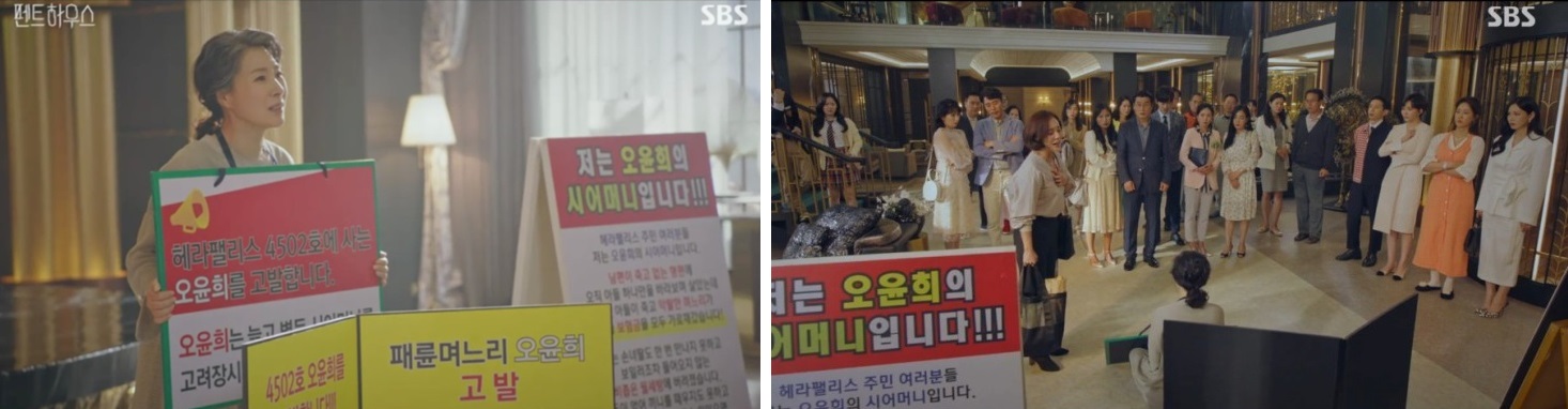 내쫒을려고 천서진이 음모를 꾸미죠. 오윤희 시어머니를 불러서 헤라펠리스 로비에서 오윤희가 아들이 죽고