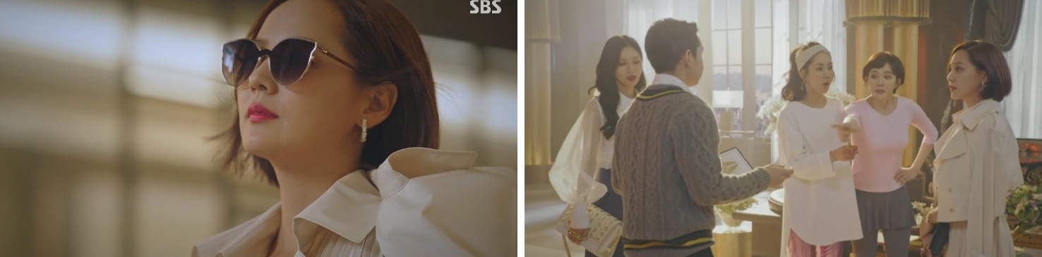 이 장면에서 천서진(김소연)의 시스루 블라우스와 화려한 숄더백 가방이 너무 눈에 띄네요.
