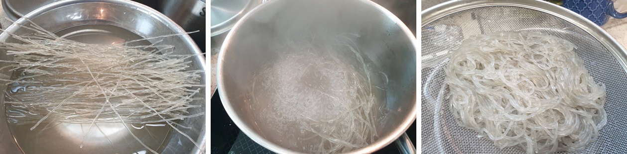 더 쫄깃한 당면이 되더라구요. 그리고 끓은 물에 5분 정도 삶고 채반에 물기를 빼 두죠.