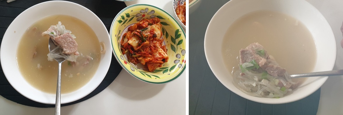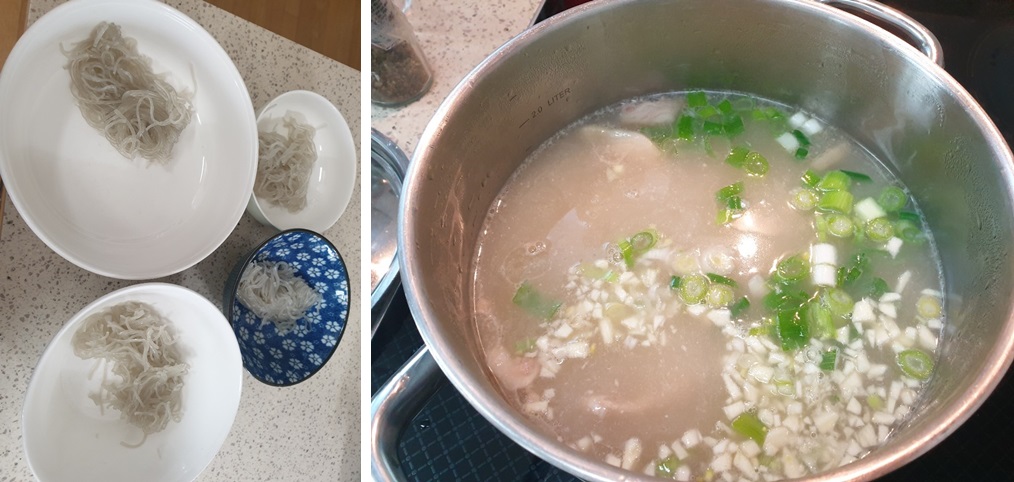우리 아이들이 좋아하는 당면과 마늘, 파, 후추 정도를 넣어서 돼지국밥을 요리해보았습니다.
