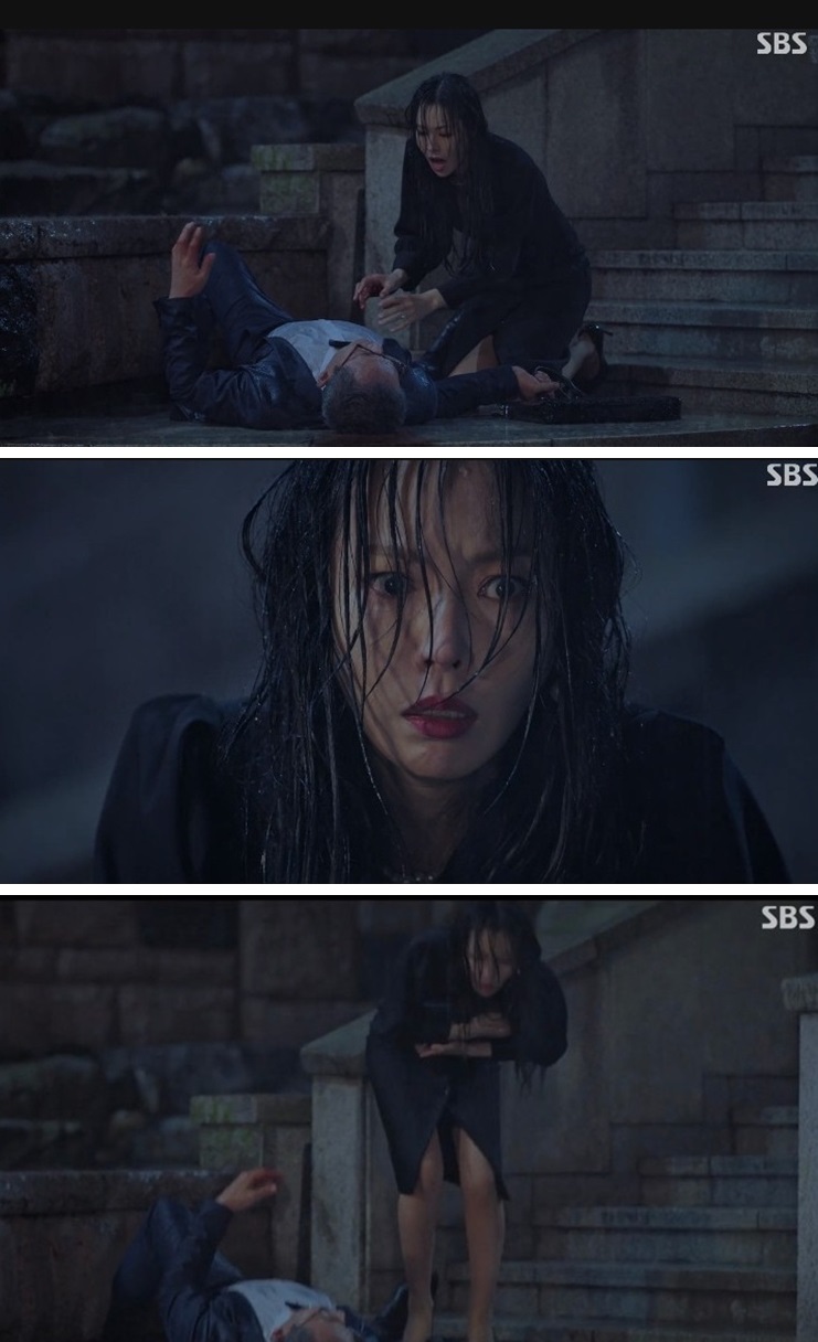 계단에서 굴러 떨어진 아버지를 보고 놀란 천서진은 아버지에게 다가가서