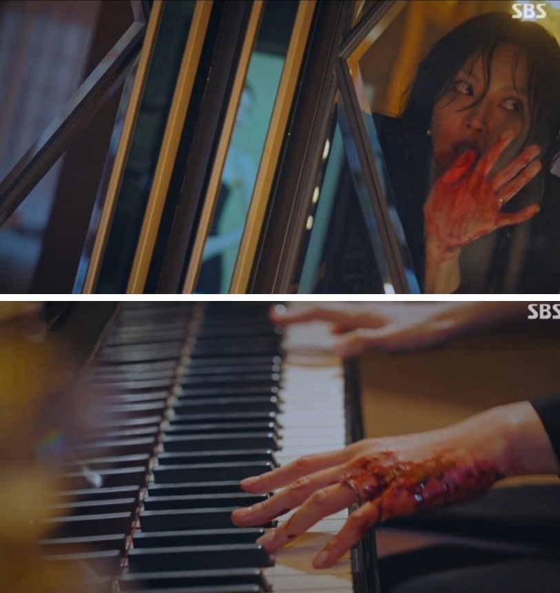 피 묻은 손으로 피아노를 치며.. 아주 정신 나간 표정을 짓고 15회가 끝이 납니다..