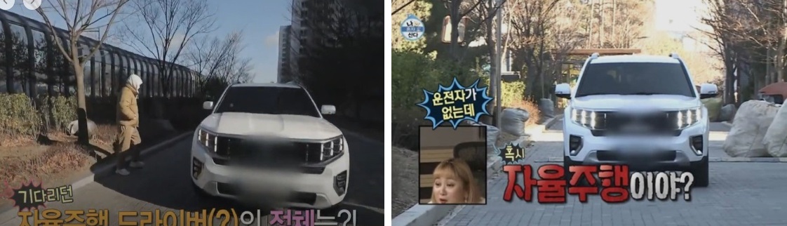 운전자가 없어 보이는 자율주행차(?) ㅋ 한대가 기안84 쪽으로 오고 있죠.