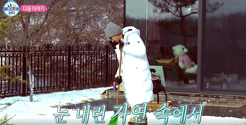 양평 전원주택에서 눈 오는날 마당에 내린 눈을 정리하고 있는 박은석 모습이