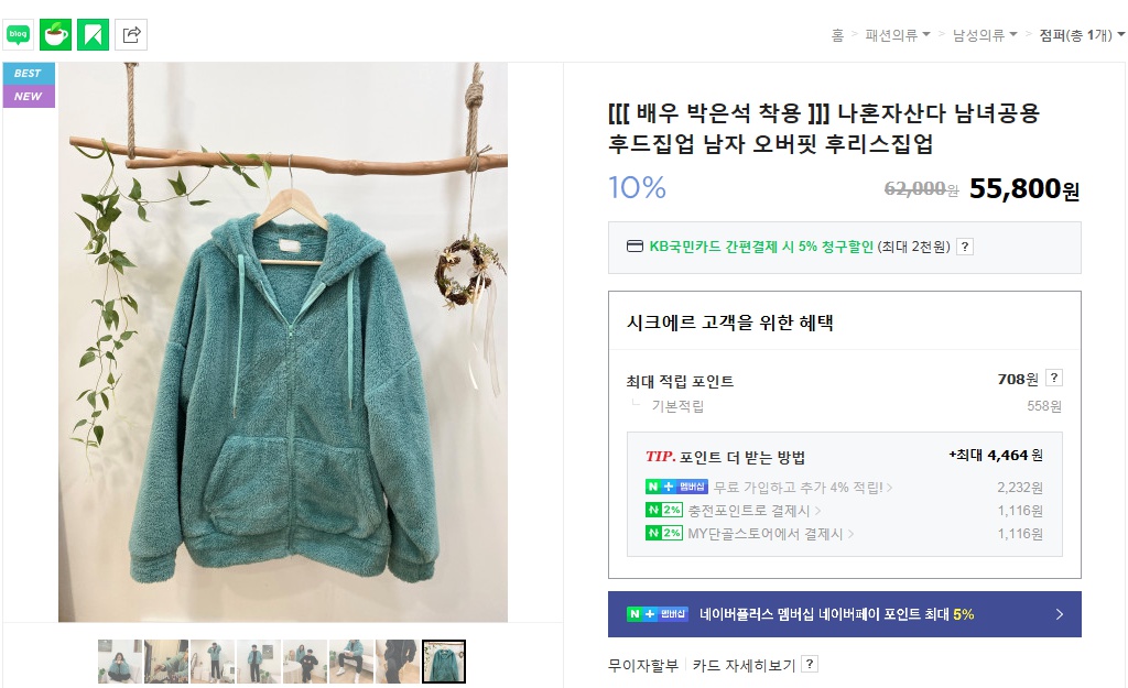 그린 계열의 후리스가 있네요. 가격은 10% 할인가로 55,800원입니다.