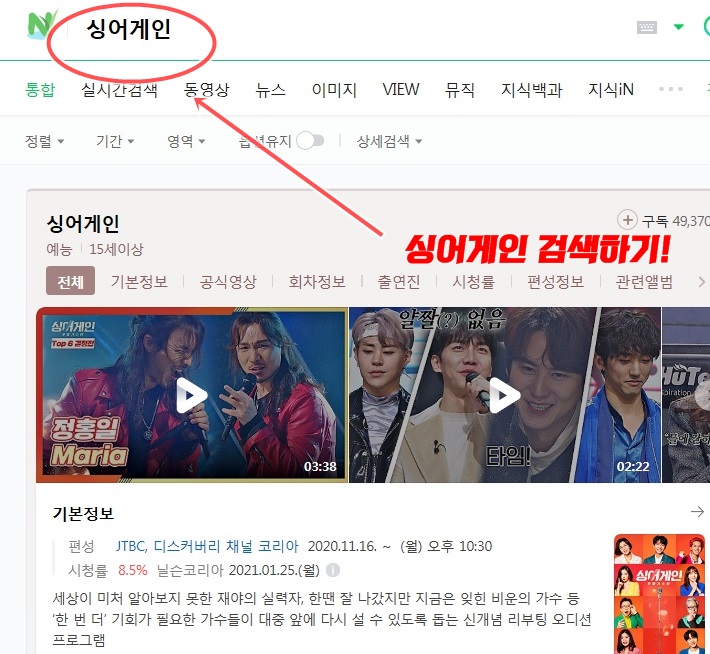 1. 포탈 네이버에 접속하여 검색창에 '싱어게인'을 입력한다.