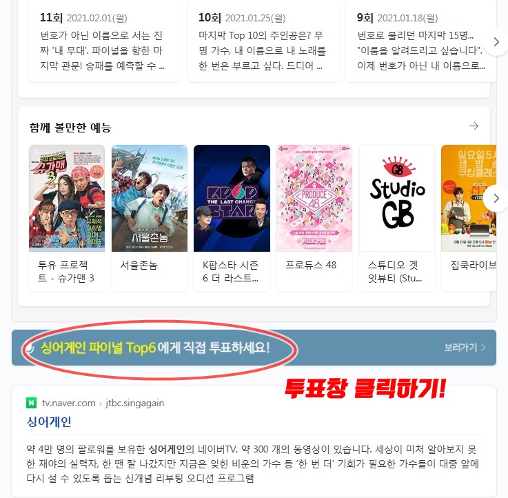 '싱어게인 파이널 TOP 6에게 직접 투표하세요' 라는 창이 보입니다. 클릭하세요!