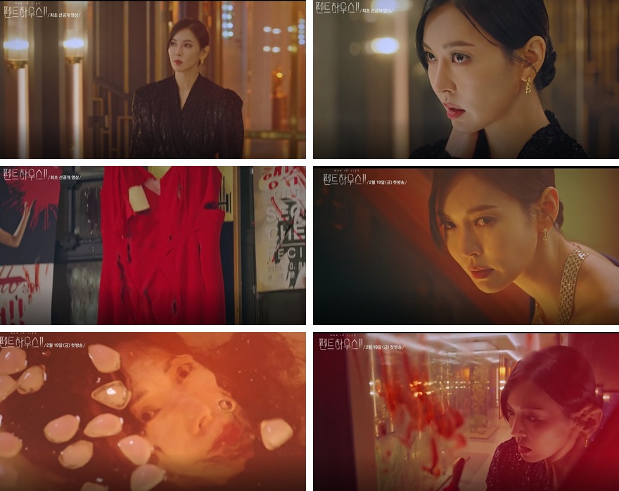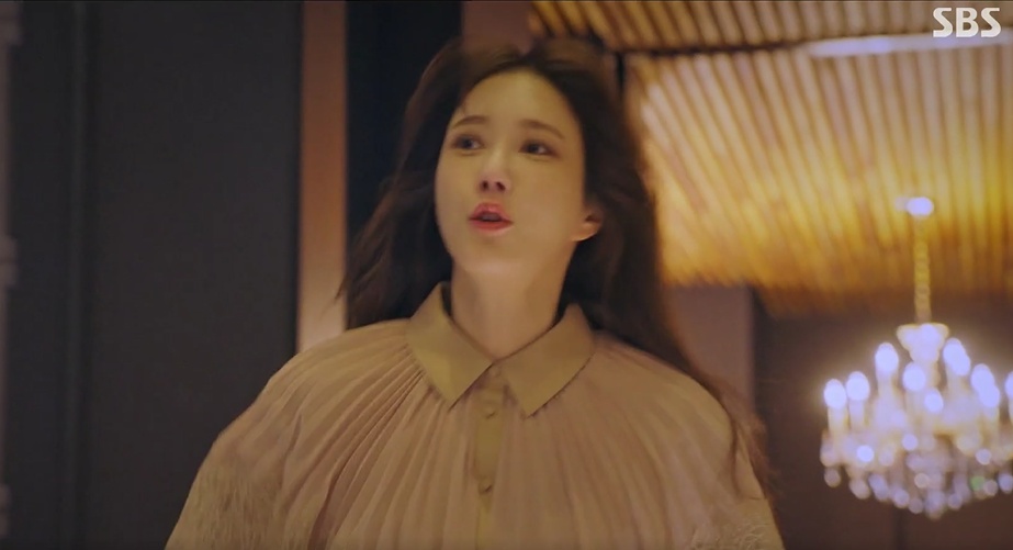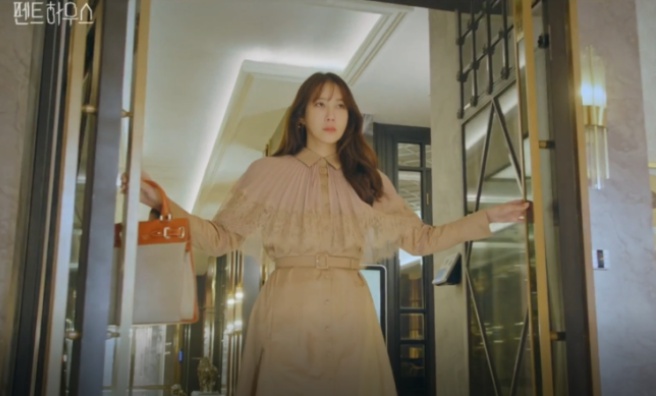 천서진은 화려한 드레스를 입고 심수련이 살았던 펜트하우스에서 기쁨에 찬 미소를 짓죠.