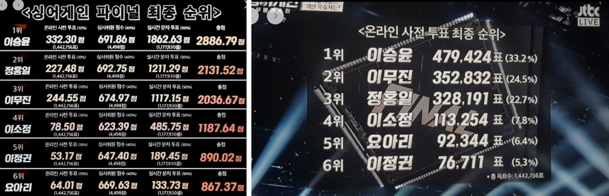 정홍일은 온라인 사전 투표와 실시간 문자투표에서 우승자 이승윤과 많은 차이를 보여서