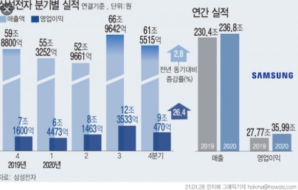 2020년 4분기 실적을 보면, 매출 61.55조원, 영업이익 9.05조을 기록했습니다.