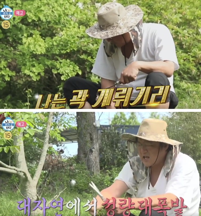 텃밭 옆 쉼터에서 곽도원은 자연스럽게 노래를 틀고 소리 높혀서 흥겹게 노래를 부릅니다.