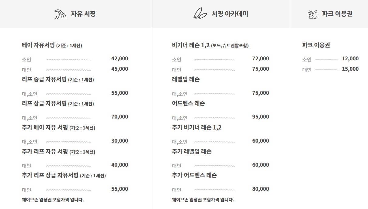 자유 서핑 가격과 서핑 아카데미 가격이 나눠져 있네요.