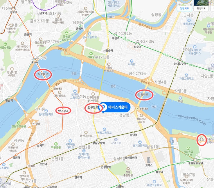 교통환경으로는 영동대교, 성수대교, 청담대교, 올림픽대로 등의 진입이 수월해 서울 전역 이동도