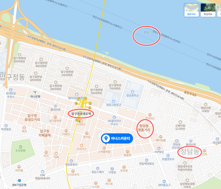'아너스카운티'의 위치를 보면 청담동 명품거리와 갤러리아 백화점 역시 도보로 10분이내로