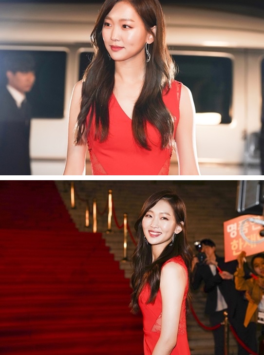 시상식에 참가하여 빨간 롱 드레스를 입고