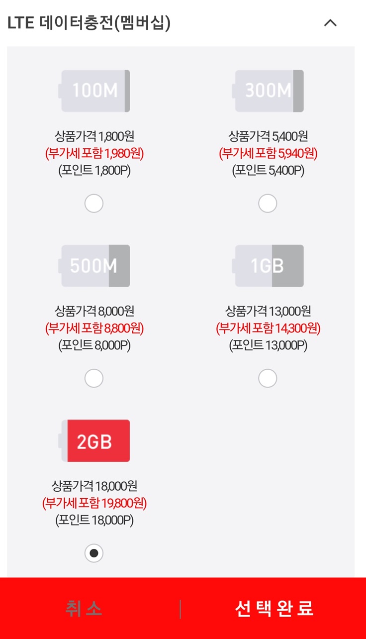 100M/ 300M/ 500M/ 1GB/ 2GB 로 충전이