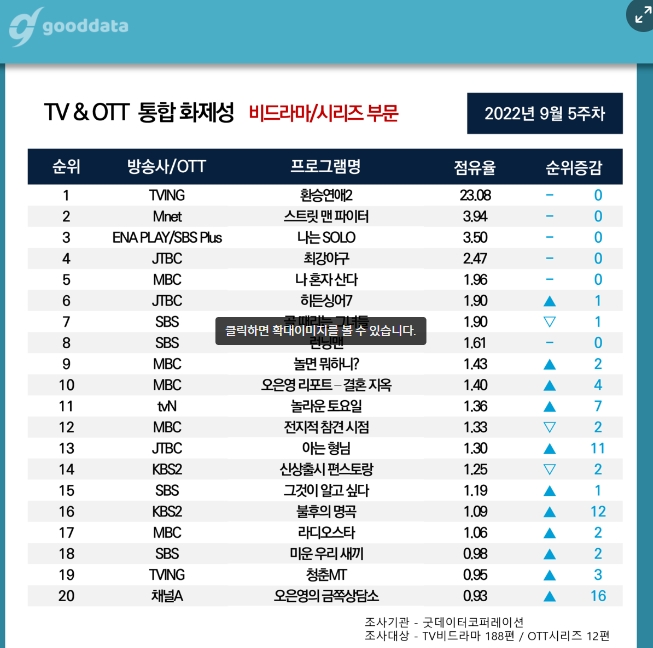 2022년의 OTT 예능 1위를 보면 티빙의 '환승연애2'