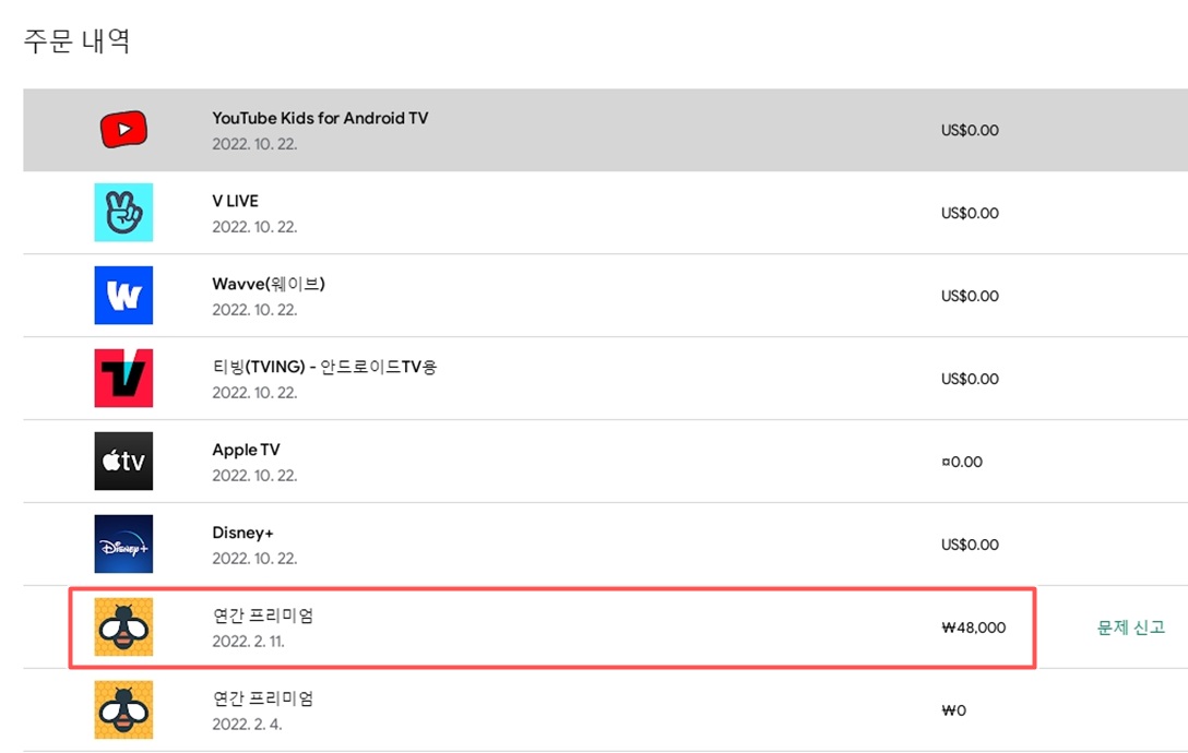 구글 플레이 환불 요청화면에 구매내역이 없다라고