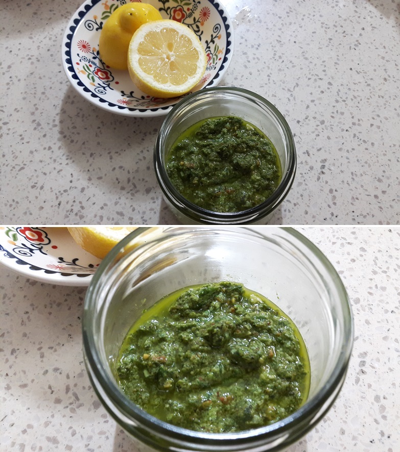 다 완성된 바질 페스토에 레몬 반개 즙을