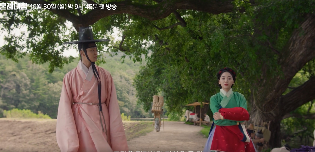 혼례대첩 예고편에서 로운과 조이현이 한복을 입고