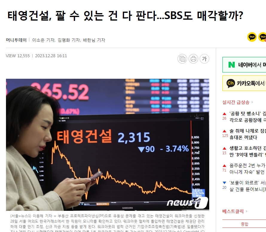 머니투데이 기사에 따르면, 태영건설 부도로 SBS 매각설이